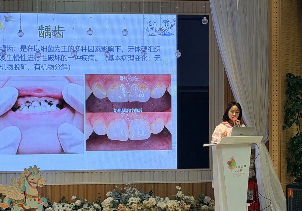 培训中,黄医生结合幼儿生长发育特点,围绕常见口腔问题、正确刷牙方法、龋齿预防、视力发育规律、用眼卫生及近视早期干预等内容进行细致讲解。针对一日生活中的保健细节,如餐后口腔清洁、读写姿势、户外护眼时长、电子产品管控等,给出了具体可操作的保育建议,帮助教职工掌握科学知识与实操技能。